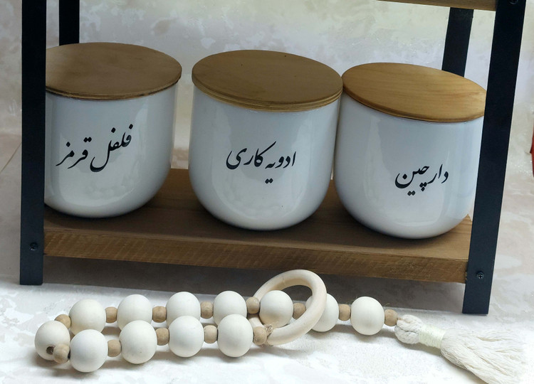 این ست سهتایی شامل ظروف سرامیکی سفید با طراحی ساده و مینیمال است که نوشتههای فارسی روی بدنه، جلوهای خاص و کاربردی به آشپزخانه شما میبخشند. دربهای چوبی با طراحی طبیعی، زیبایی و اصالت را به این مجموعه اضافه کردهاند.