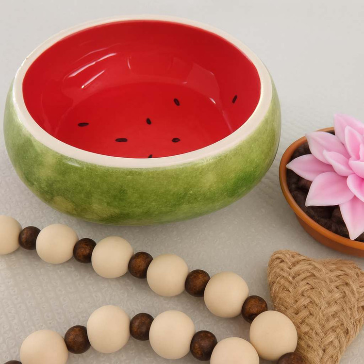 قدح خاص و چشمنواز با طراحی الهامگرفته از هندوانه، مناسب برای چیدمانهای تابستانی، سفرههای رنگی یا دکور آشپزخانه. داخل کاسه با لعاب قرمز براق و نقوش دانهمانند تزئین شده، و بیرون آن با لعاب سبز بافتدار، ظاهر پوست هندوانه را تداعی میکند.