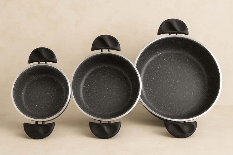 این مجموعه سهتایی ماهیتابه با پوشش گرانیتی مرغوب، ترکیبی از زیبایی، دوام و عملکرد حرفهای در آشپزی است. طراحی ساده و کاربردی، بدون درب، مناسب برای استفاده روزمره در هر آشپزخانهای.