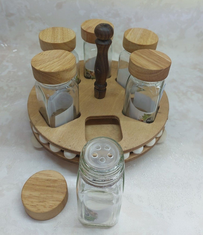 استند چوبی گرد با طراحی دستهدار، مناسب برای نگهداری و نظمدهی به ادویههای پرکاربرد روزانه. شامل ۶ عدد شیشه شفاف با درب چوبی و یک عدد سری فلزی نمکپاش برای استفاده آسانتر.